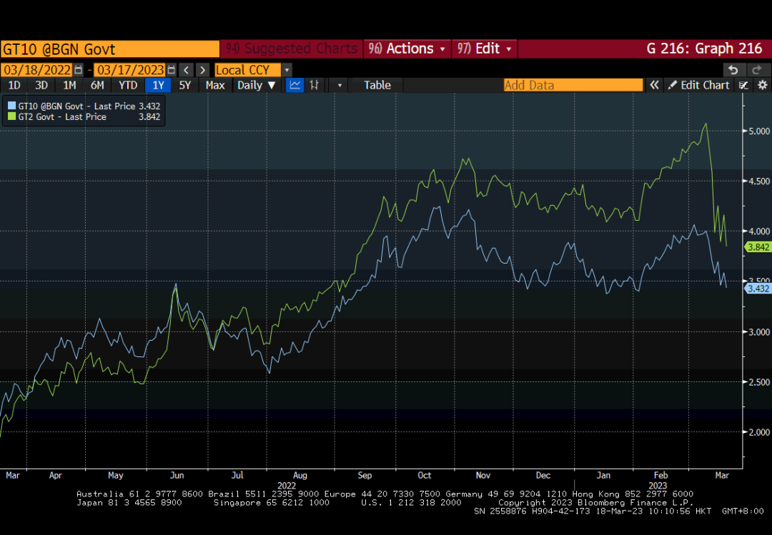 利率市场的交易就像经济衰退迫在眉睫一样。2年期美国国债收益率从周三(3月8日)的5.07%下降到周五的3.84%(7个交易日内前所未有的121bp下降),同期10年期美国国债收益率从3.99%下降到3.43%。