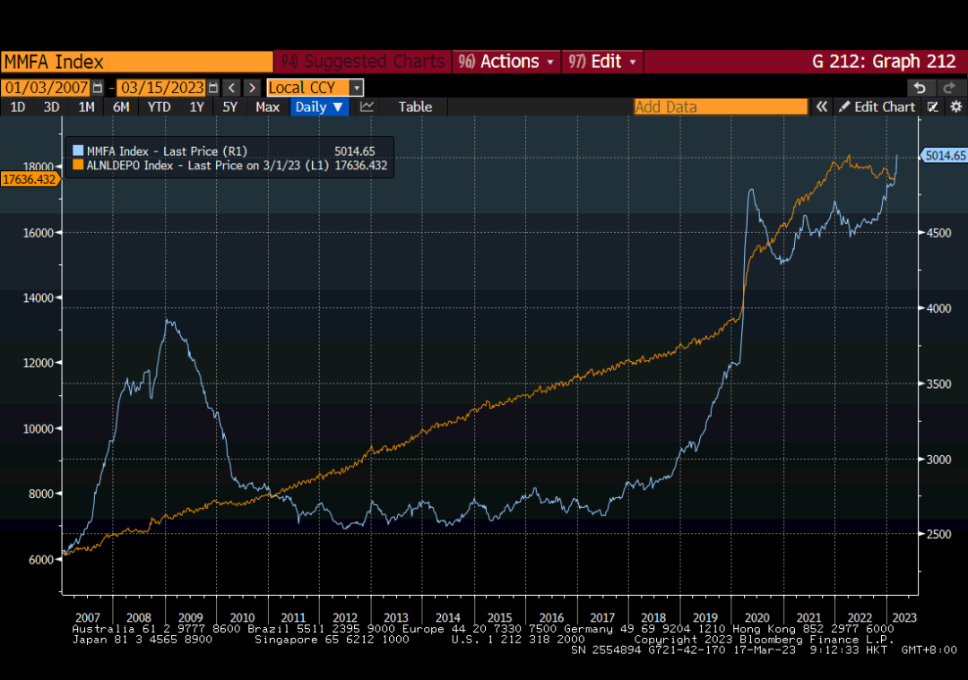 Amid the turmoil in the banking sector, investors poured US$120 billion into money market funds for the week ending March 15. MMF assets reached a new all-time high of US$5 trillion. A valid question to ask would be: what would happen to this mountain of MMF assets when yields start to decline? Could we use 2009 as a precedent?
