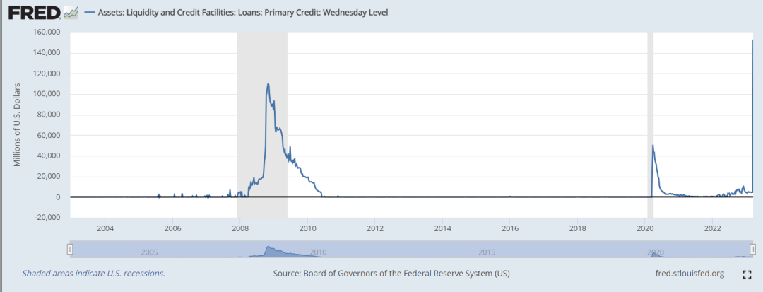 The Fed primary credit discount window lending has exploded to US$152.9 billion for the week ending March 15, significantly higher than the 2020 recession and higher than the 2008 recession. Just $11.9 billion out of the $152.9 billion is the new BTFP. It is a data point worth monitoring.