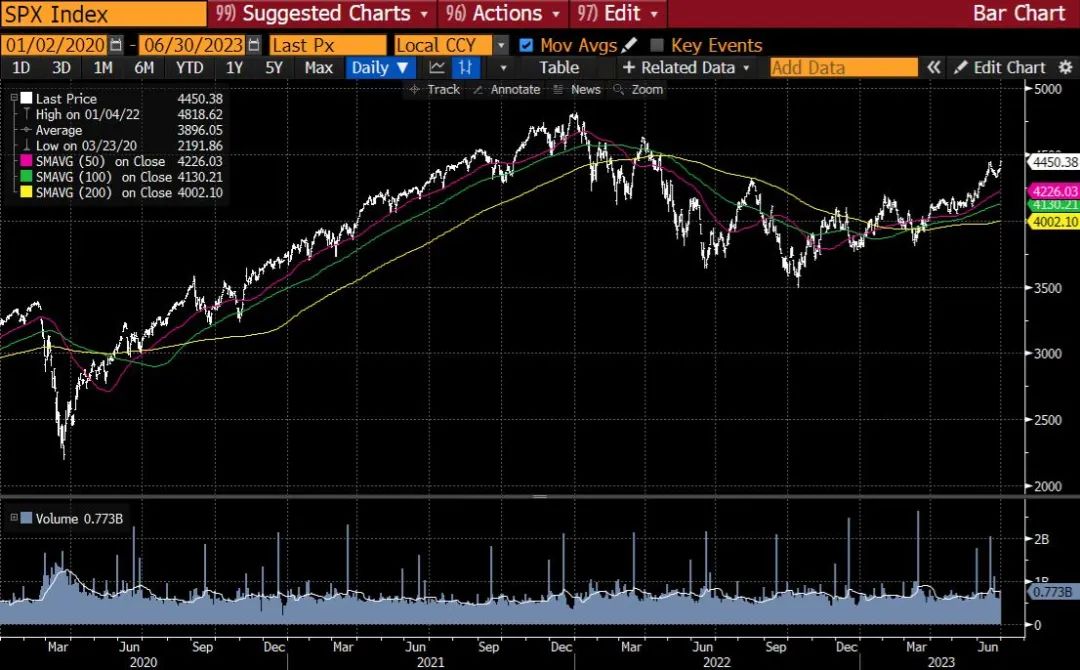 标普 500 指数在 2022 年 1 月 3 日创下历史新高,随后下跌超过 20%(熊市区域),并在10 月 12 日创下 2022 年的低点。2022 年 6 月 8 日,标普 500 指数恢复了 20.04%(自 10月 12 日的低点以来),并正式退出熊市,4 天后创下 52 周新高,并且没有回头。根据历史数据,标普 500 指数在退出熊市后有 90%的概率会走高(在未来 12 个月)。另外,从周五的收盘水平来看,8.27%的反弹将使我们回到 2022 年 1 月 3 日的历史高点。