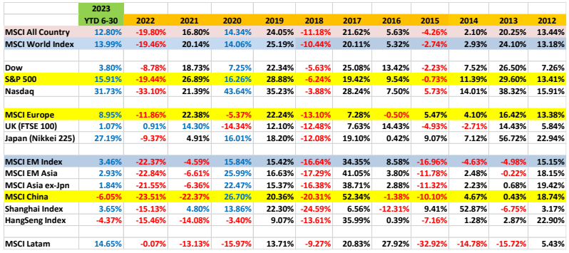 The notable disappointment was in China, with the MSCI China delivering -6.05% in the first half, and the HangSeng index with -4.37%. The global investment community has been reducing China allocation and underweighting China for over two years. China’s weighting in MSCI EM index peaked at 43.24% in October 2020, and declined to 34.72% a year later in Oct 2021, and further declined to 32.31% by Dec 2022. By May 2023, the weighting further dropped to 29.2%. I must note, valuation has dropped to irresistible levels. For investors with long-term holding power, and without the monthly/ quarterly performance pressure, the reward vs risk is attractive.