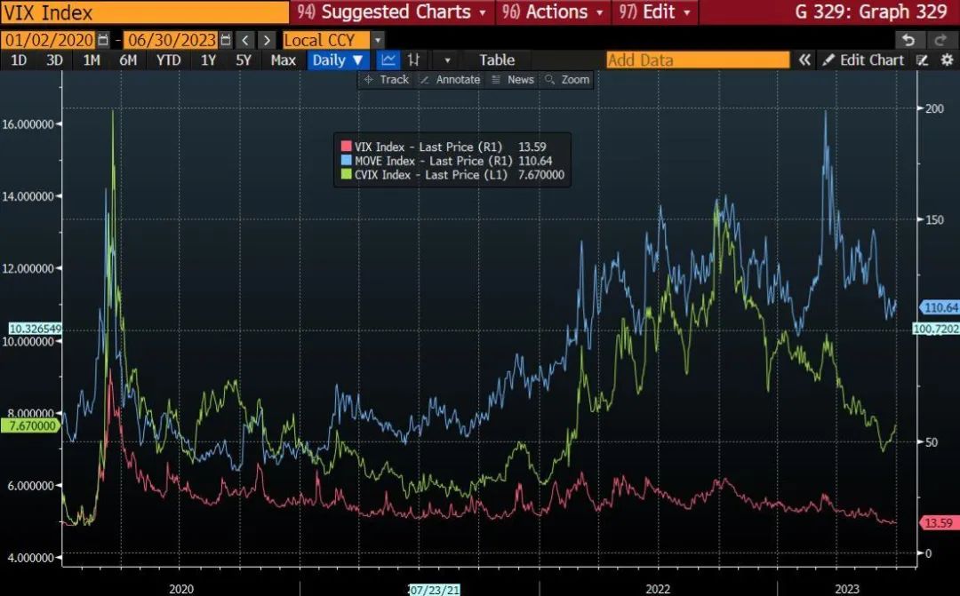 波动性(股票、利率和货币)一直在消退。特别是,VIX 指数波动率处于 2020 年 1 月以来的最低水平,这对风险资产类别来说是个好兆头。从历史上看,当我们处于低波动性状态时,它往往会持续下去,除非真正的“未知的未知”出现。由于 VIX 指数目前远低于平均水平,我们可以合理地预期,在真正的冲击到来之前,我们将处于低波动/良好回报的环境。