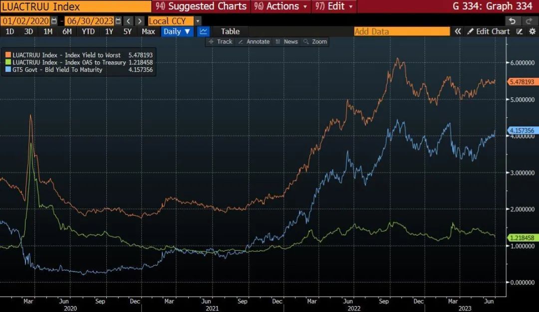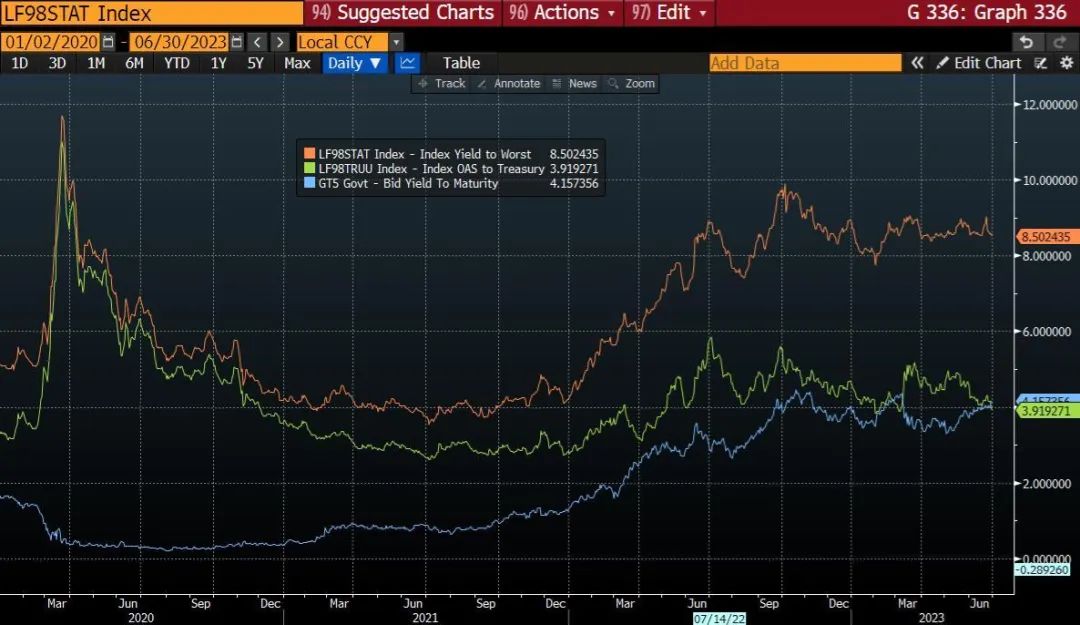 由于美国经济衰退(在未来 12 个月内)是一个低概率事件,美国信贷市场(包括投资级债券和高收益债券)提供了有吸引力的风险调整回报。值得注意的是,高收益债券信贷对总回报的贡献已经与无风险利率趋同,这对信贷来说是一个积极的信号。