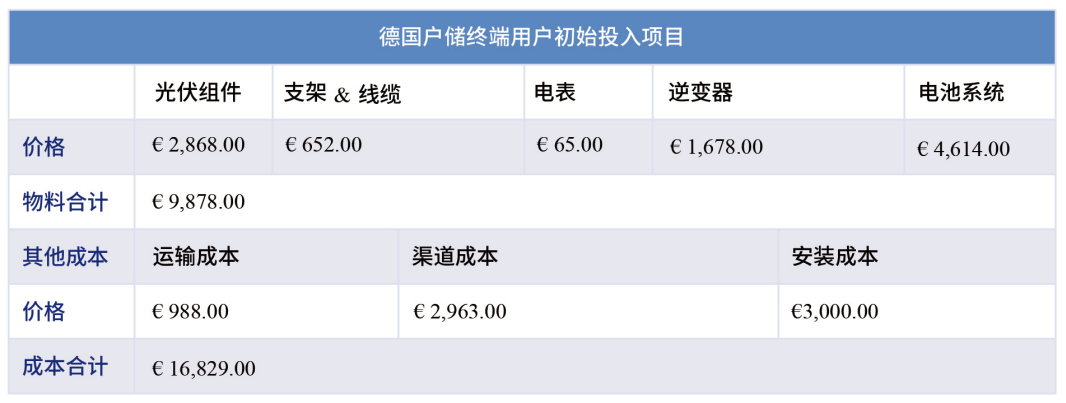 根据数据统计,2022年德国典型家庭的户用储能系统由15kWh电池系统以及10kWp光储逆变器构成,其中,欧洲容量为15 kWh电池系统的平均价格为€4614,10kWp光储逆变器的平均价格为€1678,再算上光伏组件、渠道成本、安装成本,传导到终端客户的累计成本约为€16829。