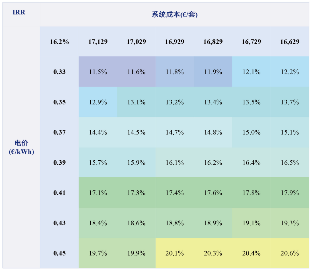 户用储能系统内部收益率对电价的敏感度较高,在系统成本不变的情况下,电价每上升€0.02/kWh,可使项目内部收益率提高1.5%。同样,若未来储能系统价格进一步下降,户用光伏配储经济性也将进一步提高。考虑后续天然气价格企稳或电费改革使居民电价持续回落,在系统成本不变的情况下,若电费降低到€0.25/kWh,投资回收期为8年,此时内部收益率为6%,仍具备一定的经济性,因此,德国终端用户预计仍将持续发展户用储能。